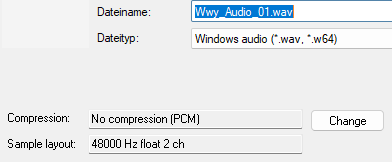 (Sicherheitshalber unter Menü Audio > Compression prüfen, dass „no compression (PCM)“ ausgewählt ist).