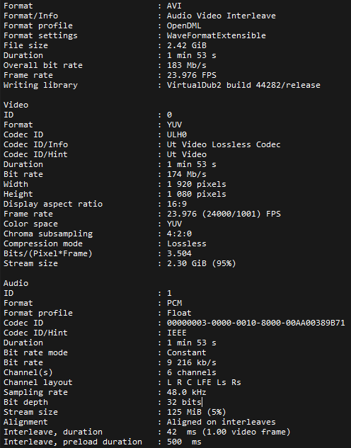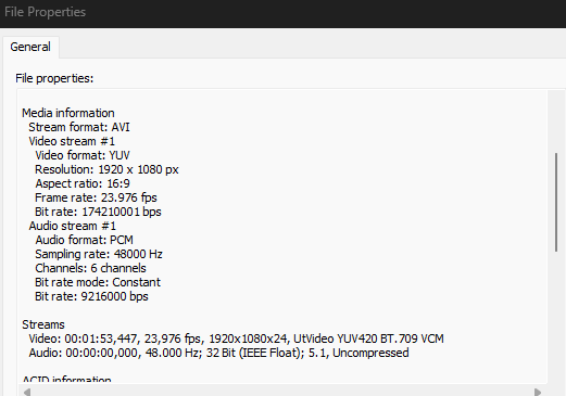 Im Guide wird für Vegas Pro der Codec „UtVideo YUV420 BT.709 VCM“ und .mov als File-Format empfohlen. Das habe ich auch entsprechend mit VirtualDub2 (Version 2.5.1.1095) durchgeführt, aber Vegas Pro gibt mir dann nur eine leere Audio-Spur mit 15 Stunden Länge!? aus. Mit dem VLC-Player wird der Clip aber ganz normal mit Bild + Ton und der gewünschten Länge ausgegeben.